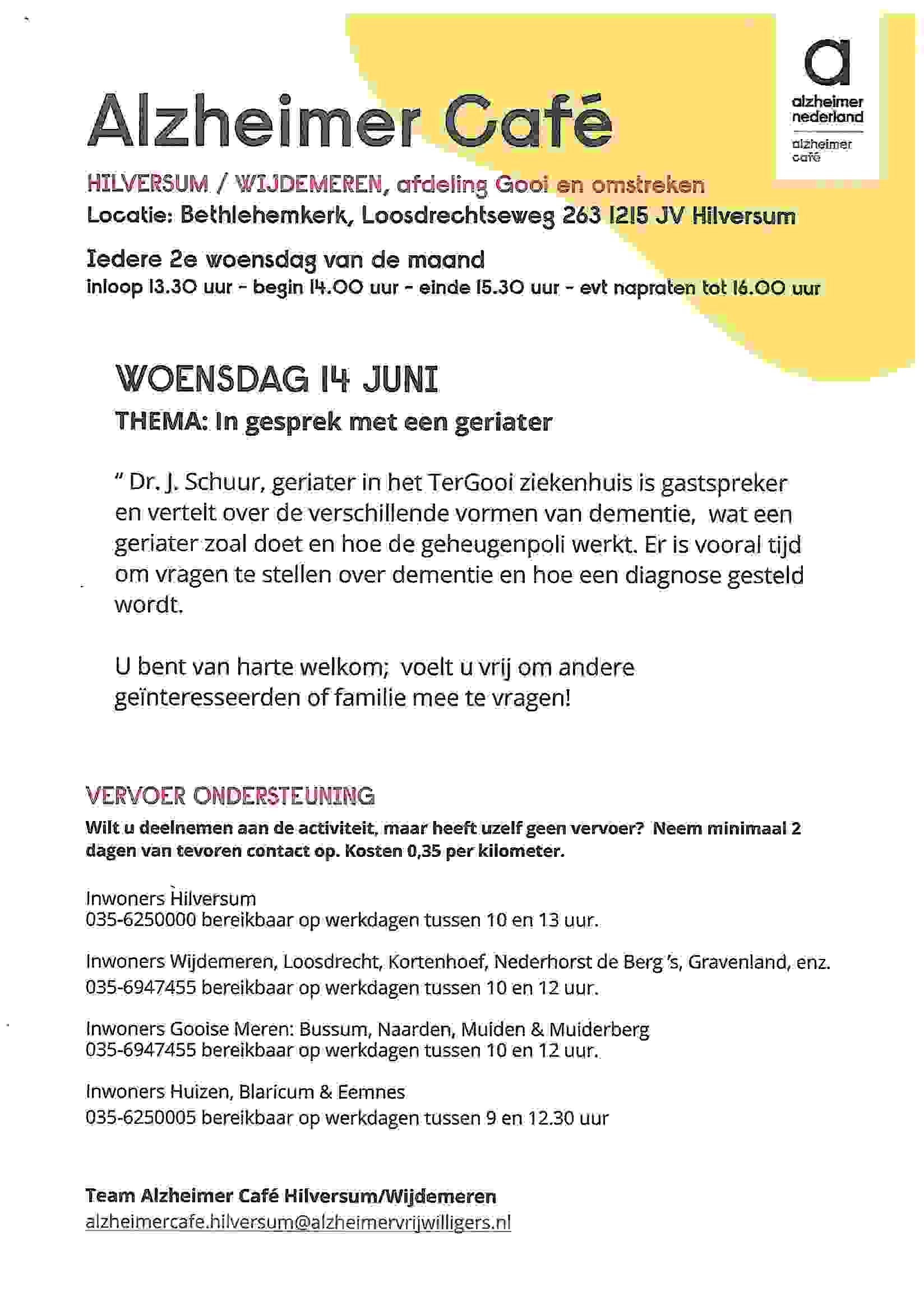Alzhemer Nederland, afdeling 't Gooi organiseert 14 juni 2023 een Alzhemer Café.